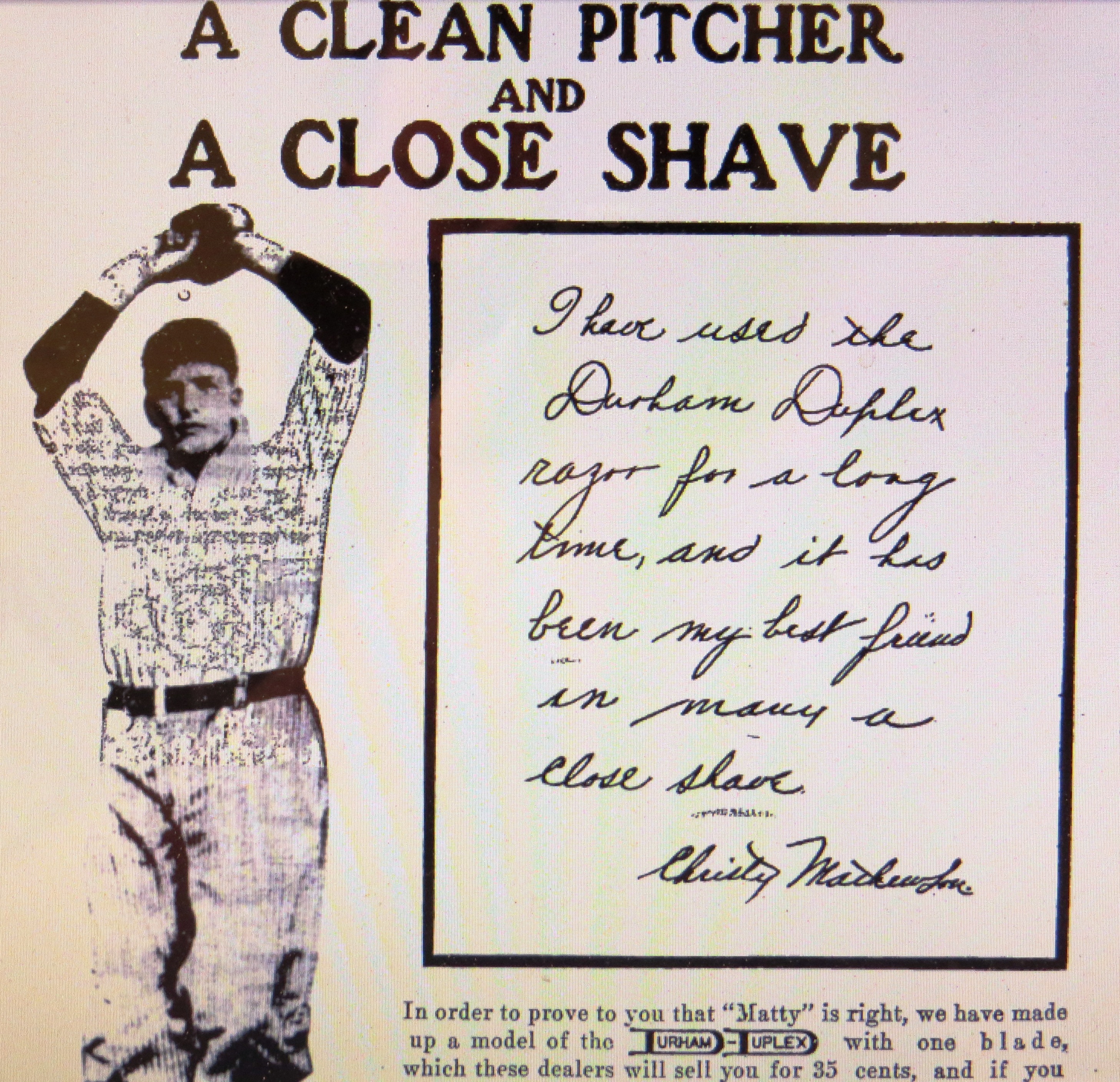 “A Clean Pitcher and a Close Shave.” Hall of Fame pitcher Christy Mathewson for the Durham Duplex razor. “Big Six” says: