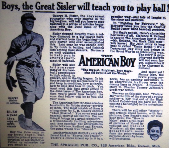 A 1918 advertisement for the June issue of The American Boy magazine featuring Hall of Famer George Sisler; at the time the magazine had a circulation of nearly 300,000 and was the most popular magazine for boys in the United States.