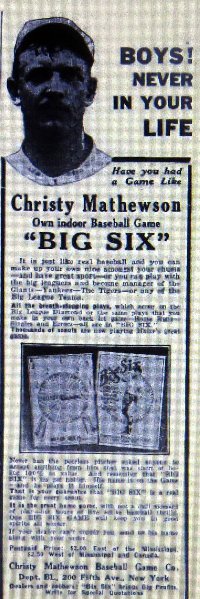 Boys! Never in your life have you had a game like Christy Mathewson Own Indoor Baseball Game “Big Six.” it is just like real baseball and you can make your own nine amongst your chums–and have great sport–or you can play with the big leaguers and be manager of the Giants–Yankees–The Tigers or any of the Big League Teams.