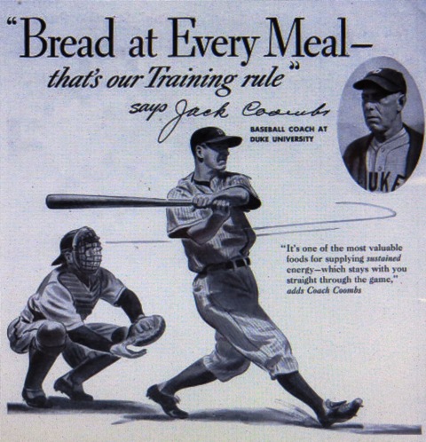 “‘Bread at Every Meal–That’s our Training rule’ says Jack Coombs Baseball Coach at Duke University. ‘It’s on of the most valuable foods for supplying sustained energy–which stays with you through the game,’ adds Coach Coombs.”