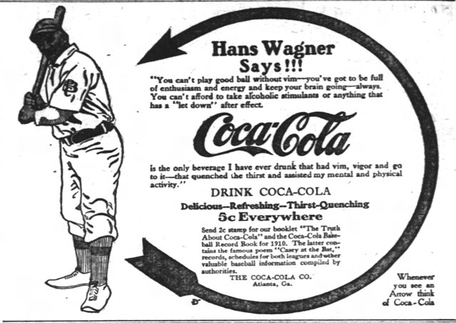 A 1910 advertisement for Coca-Cola featuring Honus Wagner (a 1908 Wagner Coke ad was featured in an earlier post).