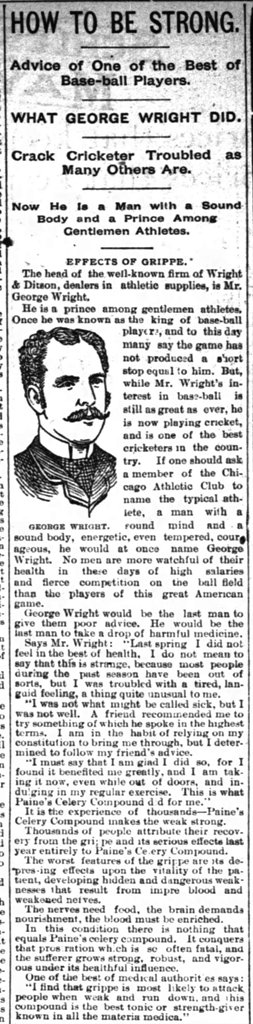 An 1890s advertisement featuring George Wright, which appeared in newspapers across the country, and presented as a regular news story, for Paine’s Celery Compound:
