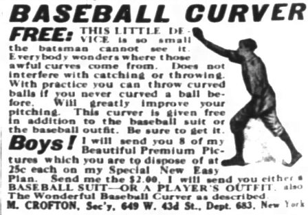 “Can you throw a baseball? If so, fifteen minutes practice with the Baseball Curver will enable you to pitch all the Curves as well as any Professional pitcher. Sent postpaid on receipt of 75 cents”