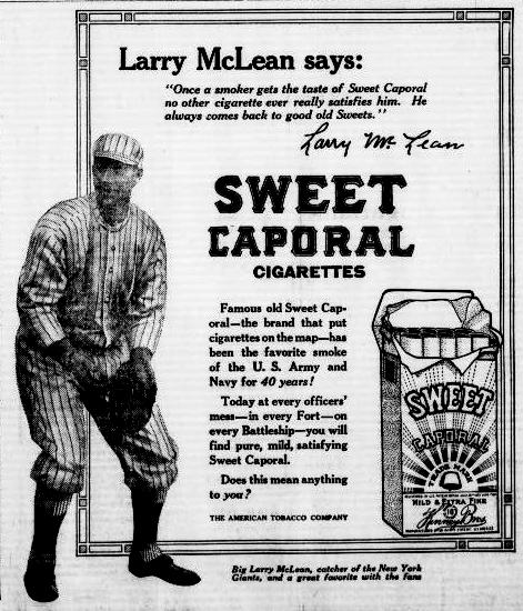 A 1914 Sweet Caporal Cigarette advertisement featuring New York Giants catcher Larry McLean “a great favorite of the fans:”