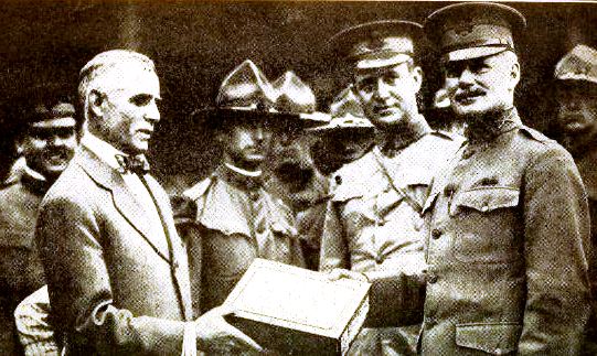 Clark Griffith presents a box of baseballs to US Army officers, 1917