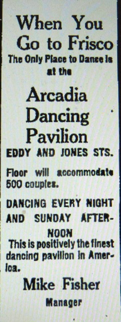 Fisher left Seattle sometime in 1911 and began operating the Arcadia Dance Hall in San Francisco.