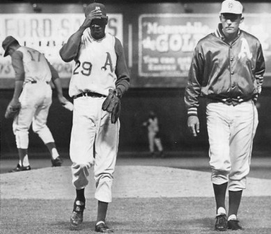 As Paige took the mound in the fourth inning, A’s Manager Haywood Sullivan, who was not consulted before Paige’s signing or before Finley announced he would pitch that night, came to the mound to remove Paige.  The pitcher walked off to a standing ovation.