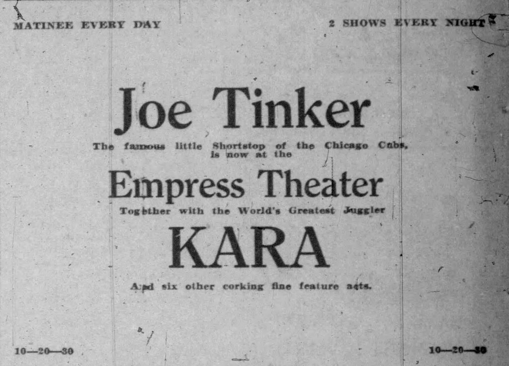 “After the close of our season in the Fall of ’09 we made an exhibition tour to the coast. On the way we stopped to play the famous Cubs in Chicago. Reaching there we found that this game assumed more importance than attached to an ordinary exhibition. Chicago had always been a good American League territory, but (Frank) Chance had a great team and the White Sox had not done well that season, and the American League supporters were very anxious that we win.”
