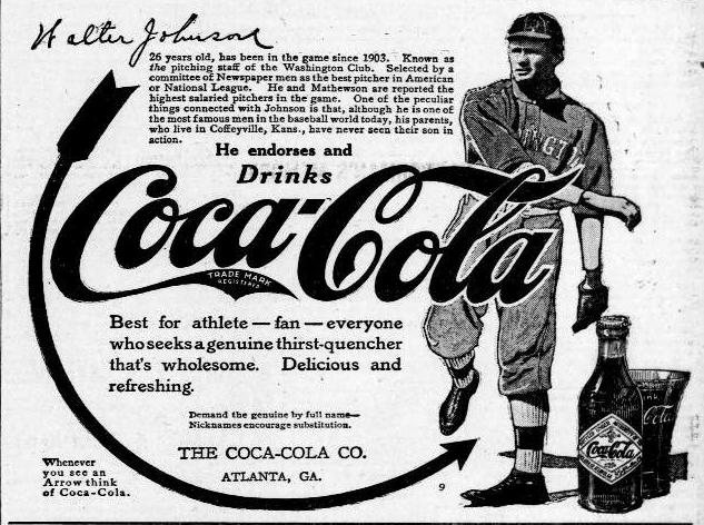 bigtrainA 1915 advertisement for Coca-Cola featuring Walter Johnson.