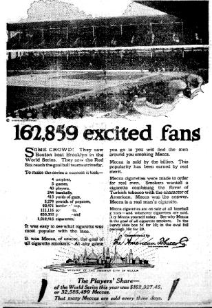 An advertisement for Mecca Cigarettes that appeared shortly after the 1916 World Series: